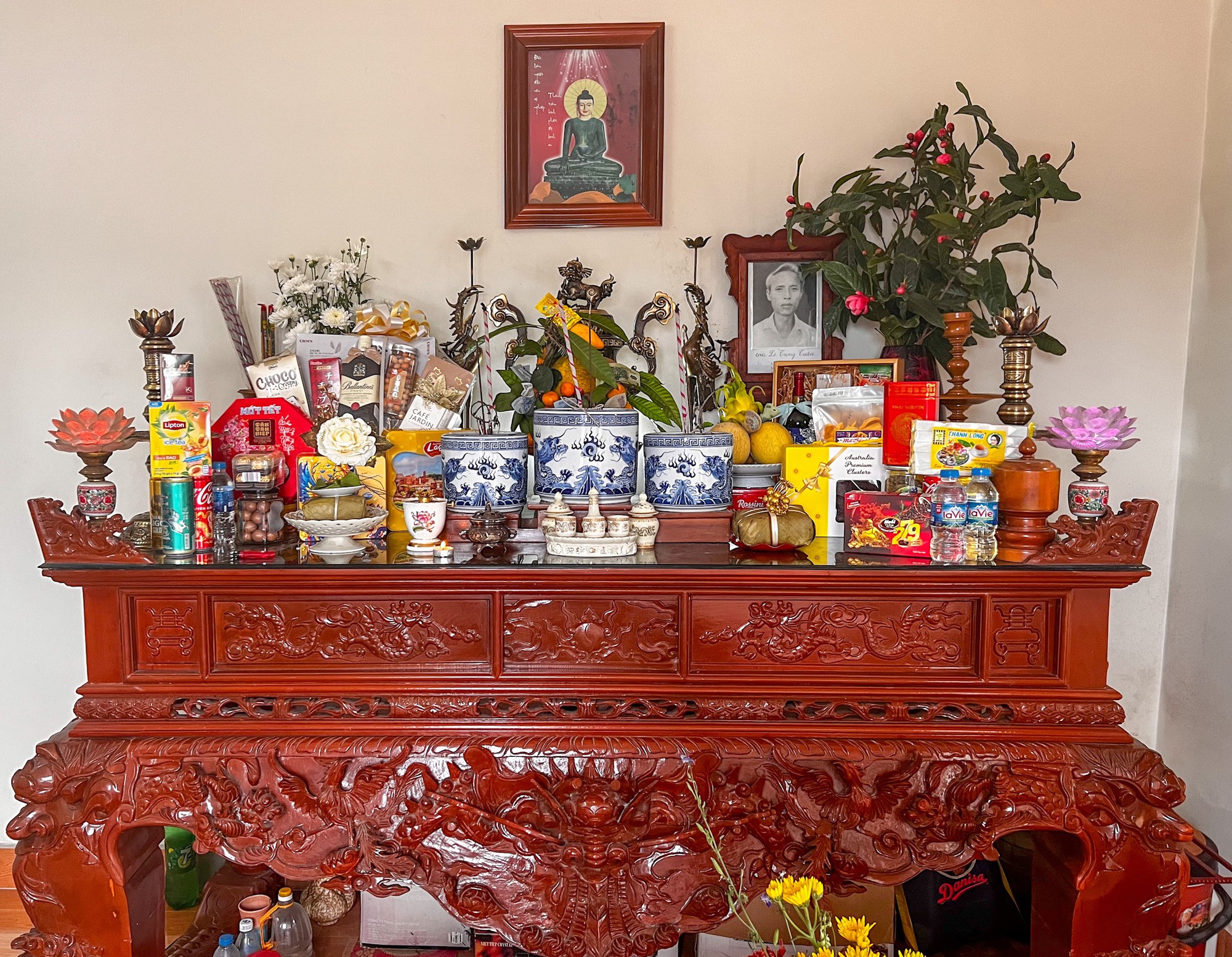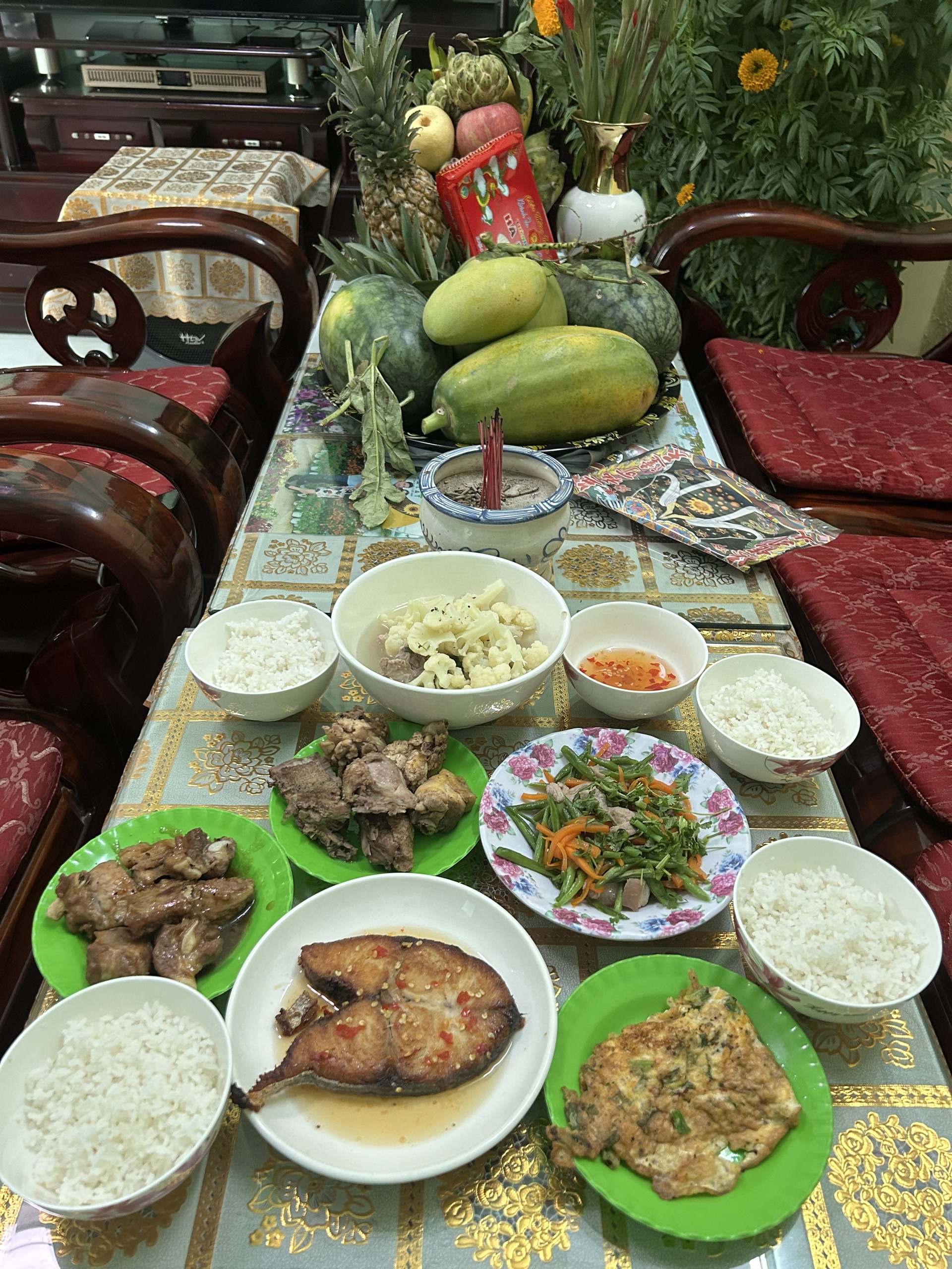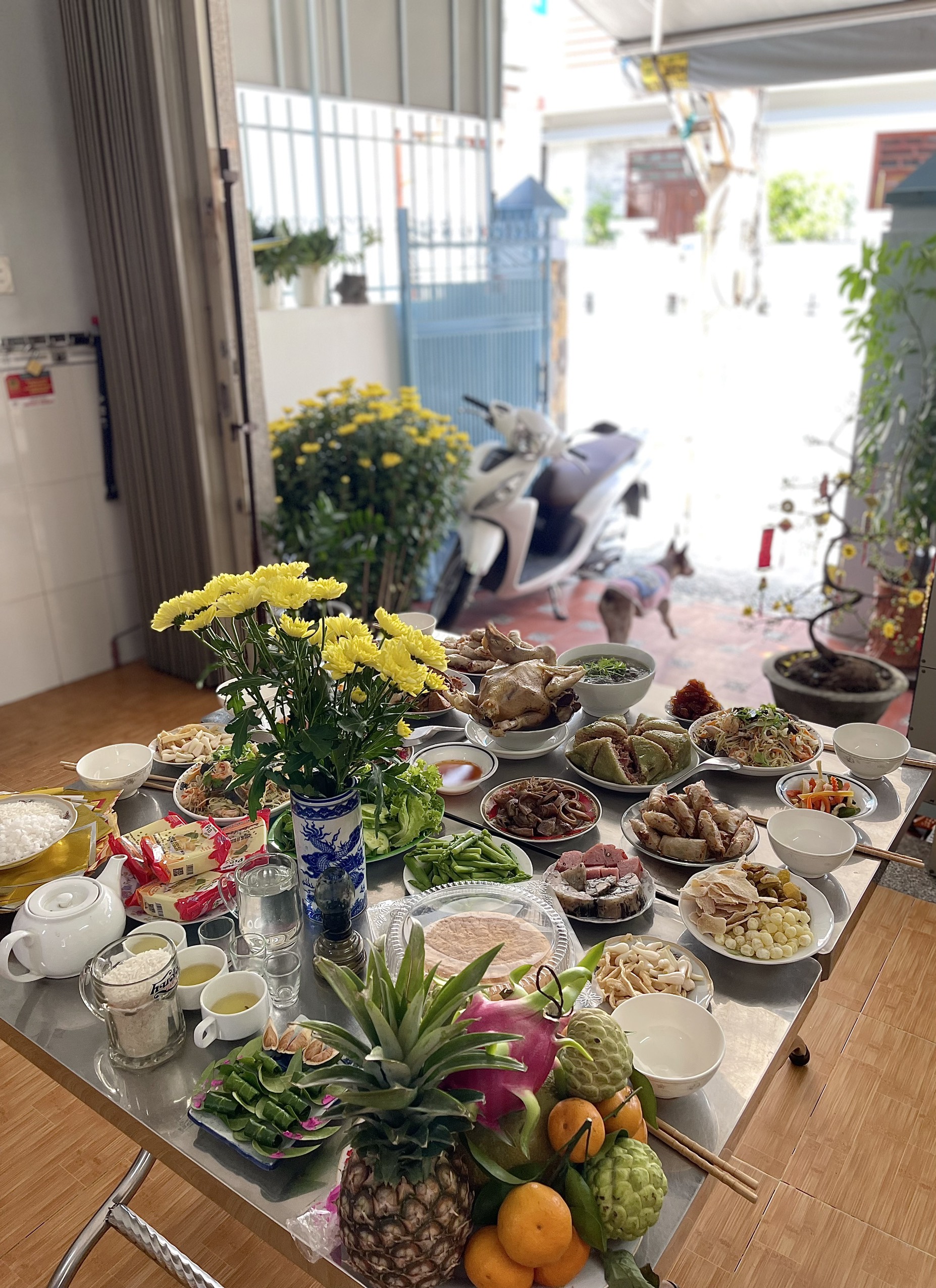 "Mình về nhà vào hôm 29 Tết, bố mẹ đã dọn nhà xong, nhiệm vụ cuối cùng là bày bàn thờ. Hôm nay thì phụ mẹ làm cơm cúng Tất niên, ăn xong sẽ đi nấu chè và chuẩn bị mâm cúng giao thừa. Mâm cúng nhà mình đơn giản lắm, thường thì sẽ có giò, chả mực, miến, thêm món xào và gà luộc", chị My My (Hải Phòng) chia sẻ.