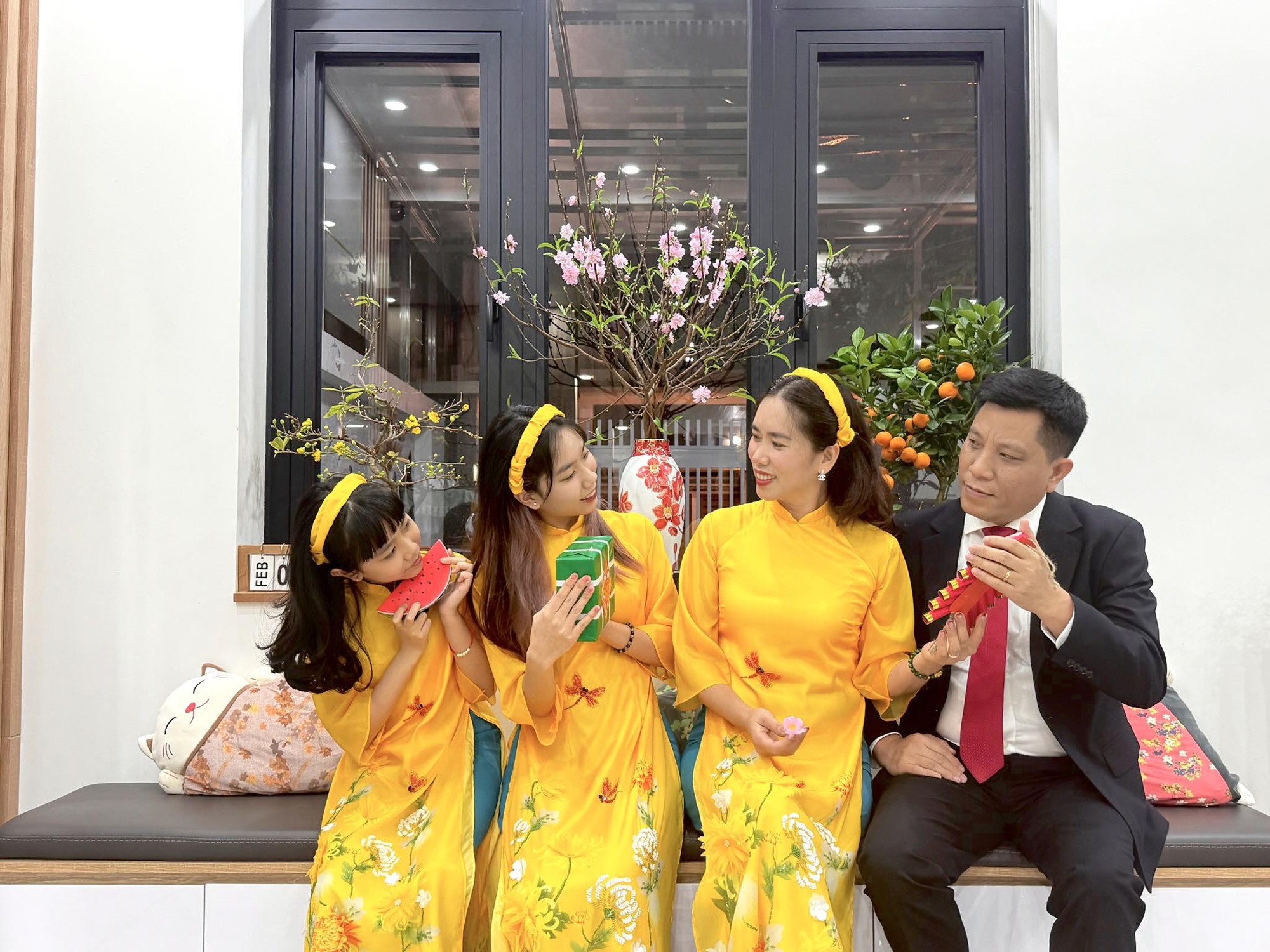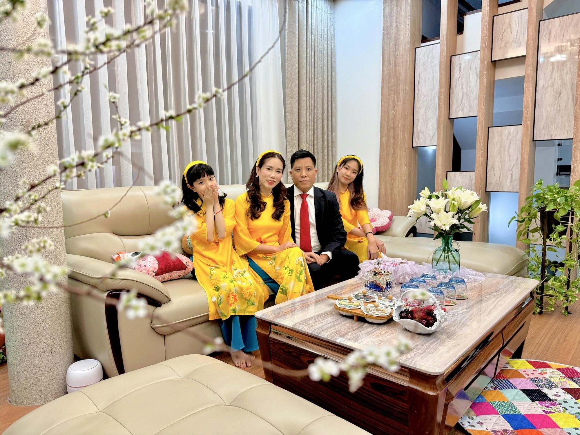 Chồng công tác đến sát ngày mới về nghỉ Tết, song gia đình chị Mai Thanh Hoa (Quảng Ninh) đã kịp hoàn thành mọi việc, chu toàn 2 bên nội ngoại. Cả nhà đã sẵn sàng lên đồ, "nhá hàng" một vài kiểu ảnh trong ngôi nhà và chờ đến giao thừa. "Lúc nào mình cũng yêu Tết và truyền cảm hứng cho các con hiểu nét đẹp văn hoá truyền thống của Tết Việt, Tết là dịp để gia đình họ hàng sum vầy chia sẻ với nhau sau một năm lao động và học tập. Sang năm mới, mình mong sức khỏe và bình an tới mọi nhà, mọi người, Gia đình mình luôn ngập tràn tình yêu và hạnh phúc thế là mình đã mãn nguyện lắm rồi".