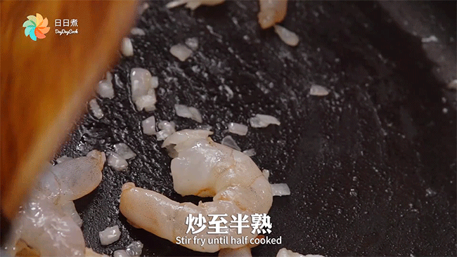 Cho hành vào phi thơm, sau đó cho tôm vào xào qua.