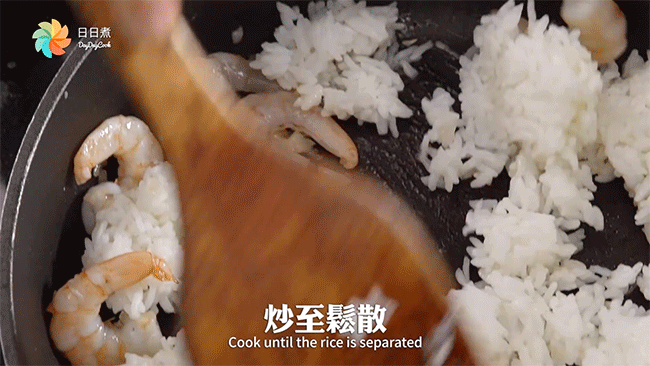 Tiếp tục đổ cơm vào đảo cho đến khi các hạt cơm tơi ra và tách rời nhau.