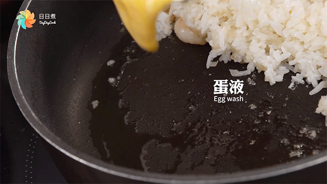 Trong một góc chảo, đổ trứng vào chiên qua rồi đánh đều lên với phần cơm vừa rồi.
