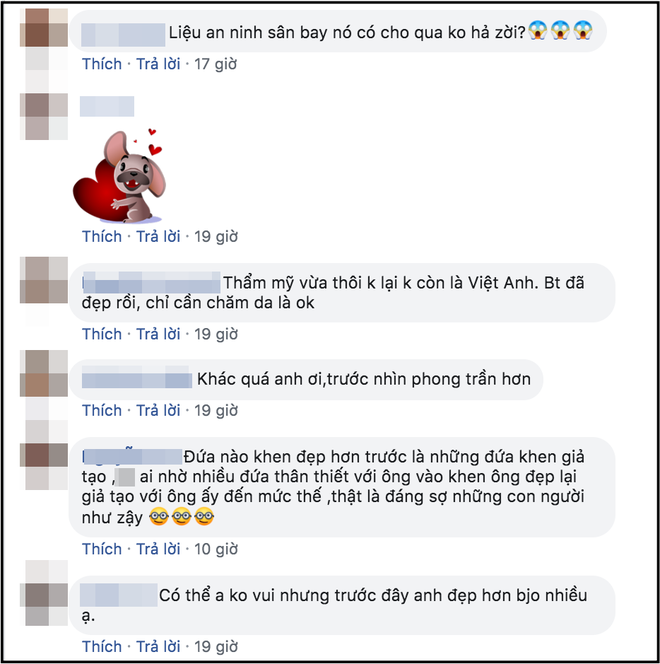 Sau ly hôn, Việt Anh đã khiến nhiều người vô cùng bất ngờ khi cùng Quế Vân sang Hàn Quốc phẫu thuật thẩm mỹ cải thiện nhan sắc. Vào ngày 6/7 vừa qua, nam diễn viên "Người phán xử" đã đăng tải hình ảnh cận mặt sau phẫu thuật. Theo đó, ngoài nâng mũi, Việt Anh còn bị nghi làm cằm, hút mỡ mặt khiến gương mặt trở nên khác lạ tới mức khó nhận ra. Diện mạo mới này của anh đã nhận về không ít phản ứng trái chiều từ công chúng. Trong đó, một số bạn bè đồng nghiệp và cả khán giả đều tiếc nuối vẻ điển trai trước đây của anh, cho rằng nam diễn viên đã làm mất nét đẹp vốn có.